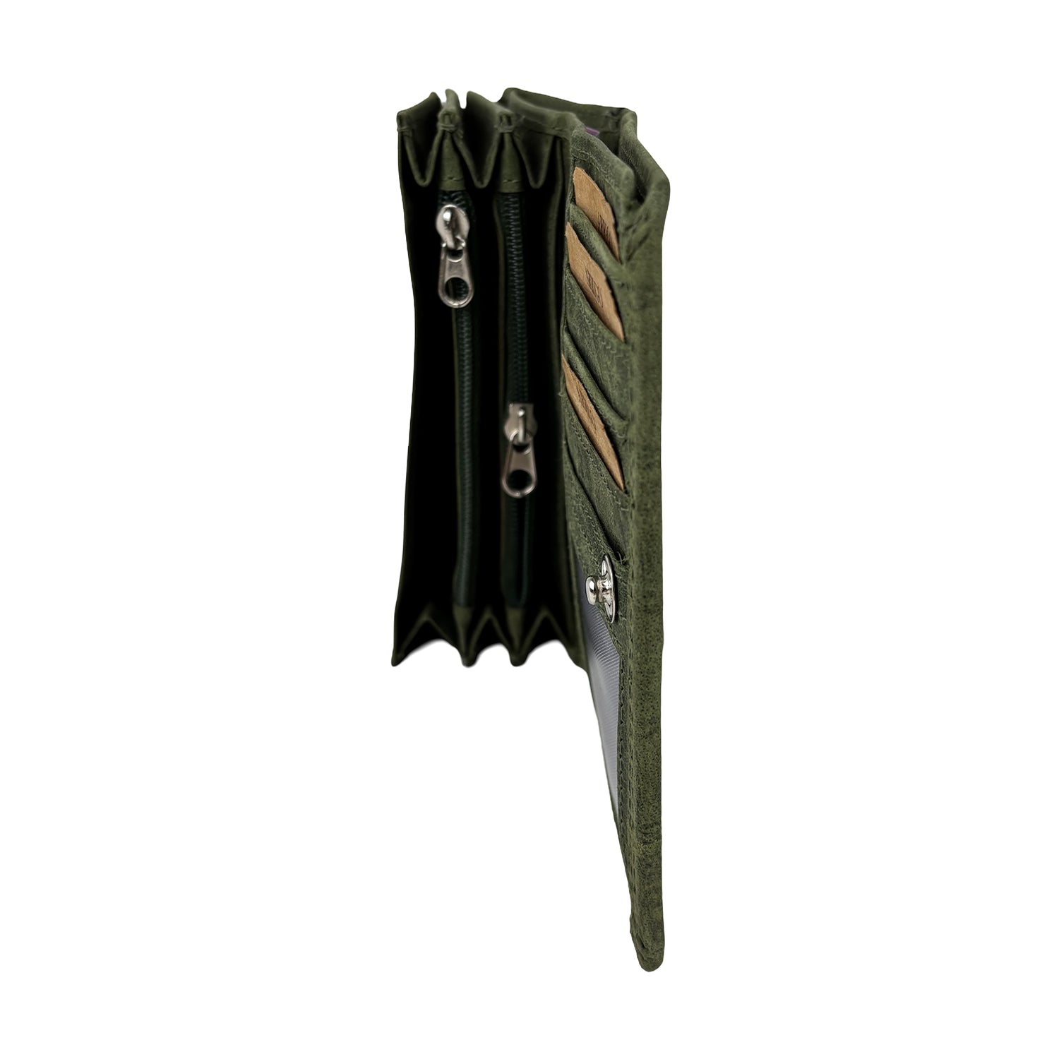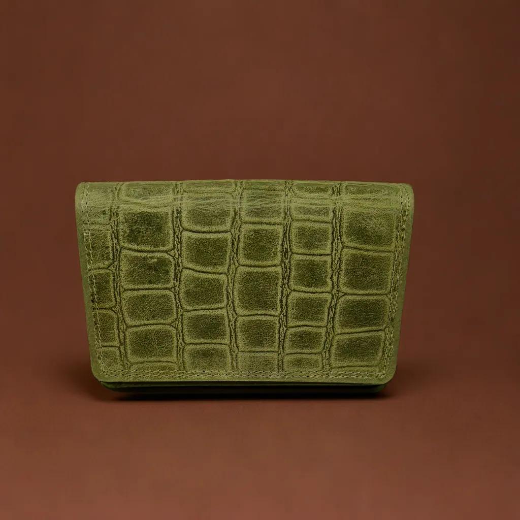Onze groene krokoprint portemonnee combineert een frisse, natuurlijke uitstraling met praktisch gemak en optimale veiligheid. Dankzij de geïntegreerde RFID-bescherming zijn je pasjes beschermd tegen ongewenst uitlezen, zodat jij onbezorgd onderweg bent. Gemaakt van hoogwaardig rundleer met een luxe krokodillenstructuur, is deze portemonnee een stijlvolle en functionele metgezel voor elke dag.
