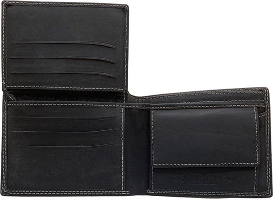 Ontdek de platte billfold portemonnee van Arrigo, gemaakt van hoogwaardig zwart buffelleer met een vintage uitstraling. Deze portemonnee is perfect voor de moderne man die op zoek is naar een stijlvolle en praktische oplossing voor zijn financiën. Met een slimme indeling voor briefgeld, pasjes en muntgeld houdt deze portemonnee alles netjes georganiseerd.